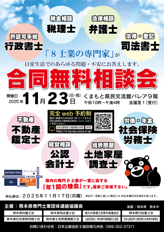 2025年11月23日(日・祝日)、くまもと県民交流館パレアにて、熊本県の8士業による「合同無料相談会」が開催されます。